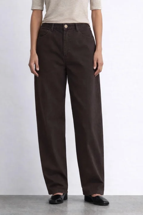 Jean rígido calce wide leg barrel con pierna levemente ovalada y ancha. Es tiro alto color chocolate intenso. Tiene hilo a tono, los avíos color cobre florentino y el ruedo clásico.