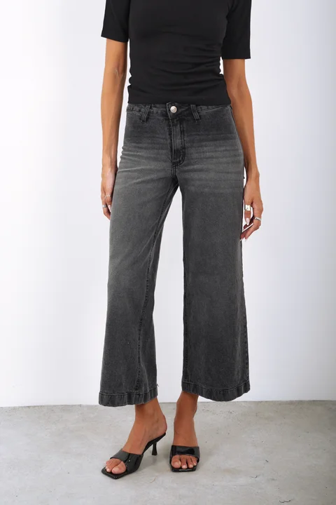 Jean semi rígido calce wide leg. Es tiro alto, color gris oscuro bien gastado con bigotes y localizado suaves. Tiene las costuras color negro, los avíos níquel viejo y el ruedo ancho.