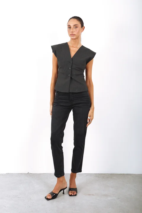 Jean semi rígido calce mom con pierna recta y tiro alto. Es color negro gastado con localizado y bigotes suaves. Tiene las costuras y los avíos a tono y el ruedo clásico.
