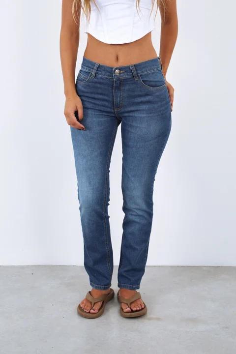 Jean elastizado calce slim, tiro medio. Es color azul intenso con localizado y bigotes suaves. Tiene las costuras color camel, los avíos níquel viejo y el ruedo clásico.