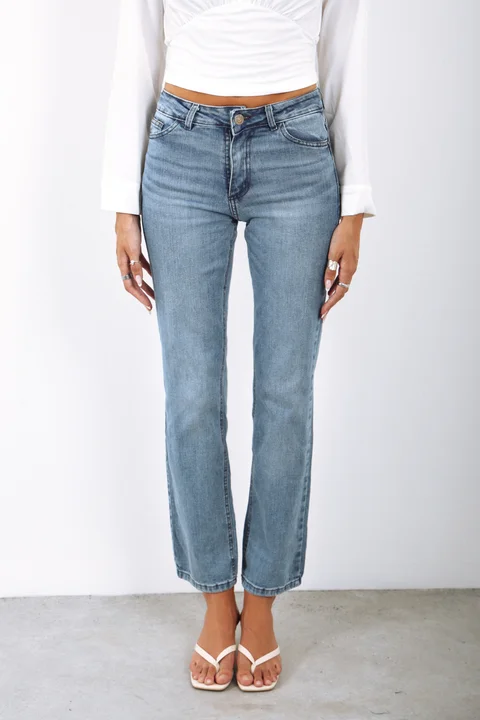 Jean de calce recto semi elastizado. Es tiro alto, color azul medio bien gastado, con localizado y bigotes marcados. Tiene las costuras color marrón, los avíos níquel viejo y el ruedo clásico.