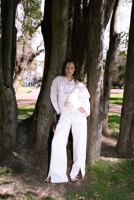 Jean rígido calce wide leg color marfil. Es tiro medio/alto y el detalle especial de este modelo es que tiene la costura lateral que viene hacia adelante y termina en tajo. Las costuras color camel claro y los avíos cobre brillante.